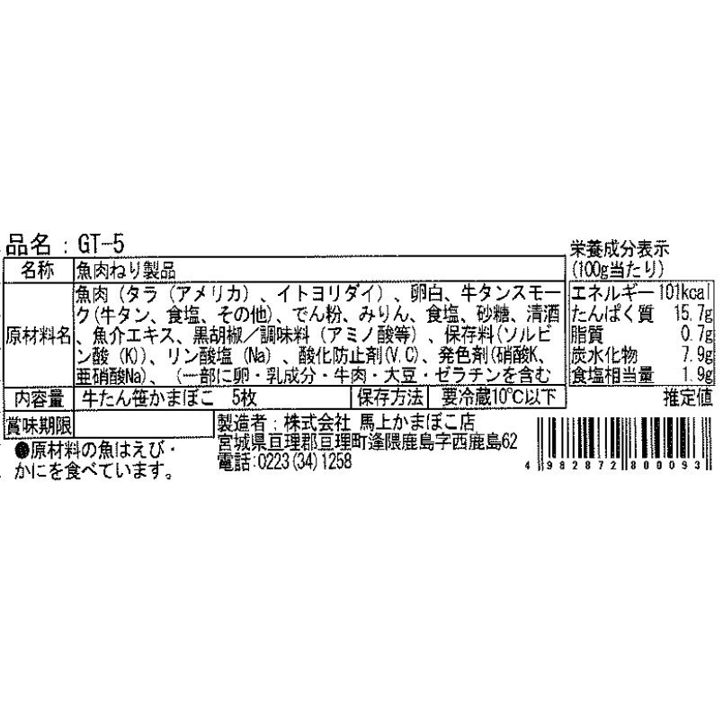 馬上かまぼこの牛たん笹かまぼこ5枚袋入り