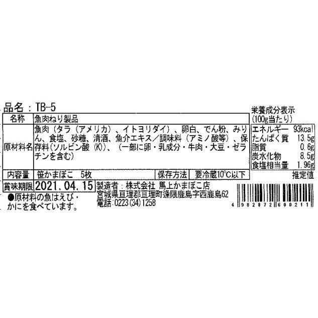 馬上かまぼこの笹かまぼこ5枚袋入り