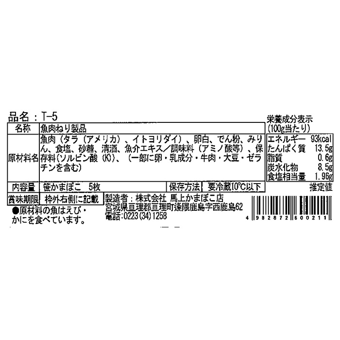 馬上かまぼこの笹かまぼこ5枚袋入り フレッシュ食感の和紙包装タイプ